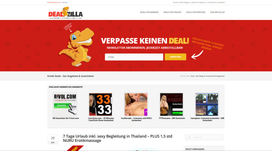 DealZilla Schnäppchen und Deals für Erwachsene. Hier sparst du bei Dessous, Reisen oder Sextoys. Leidenschaft muss nicht teuer sein!Webadresse: https://dealzilla.tv